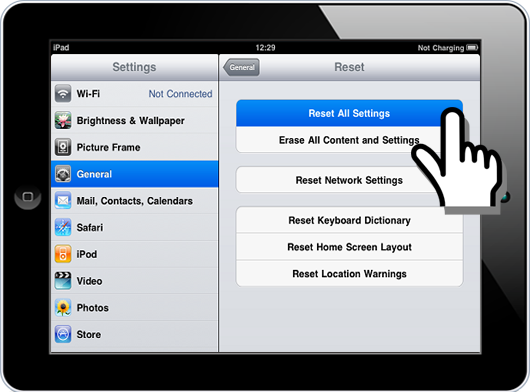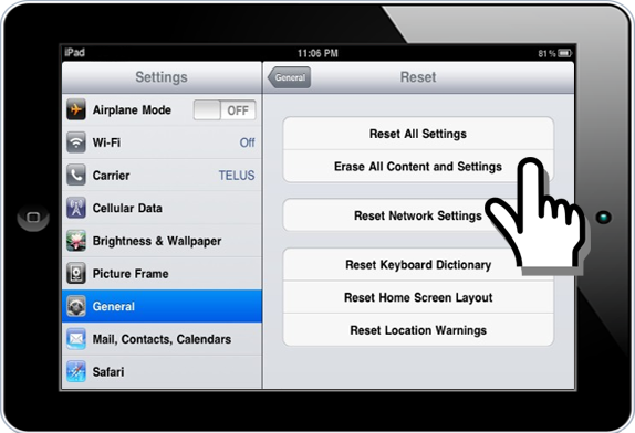 Note: This will reset all settings to the default settings and all of your information and media will be erased.