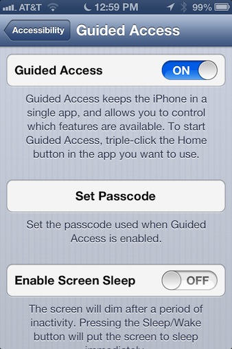 Apple has extended the Supervise functionality of Apple Configurator (and the tools that integrate with it), by including a set of more stringent options that can be configured. The Guided Access restriction allows IT to “lock” an iPhone or iPad into using just one app. Essentially, this feature disables the iOS home button and locks the iPhone or iPad into a single app. The feature is especially useful for iPads being used in a retail setting as a kiosk or as a digital menu in a restaurant. Furthermore, iOS 6 offers restriction options that can be used to limit which apps work on an iPhone or iPad, which will increase security and reduce headaches for the IT department. This feature can be manually enabled via the Accessibility option under settings > general. Along the same vein, supervised devices can disable or block the use of Apple’s iMessage system and Game Center.