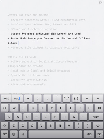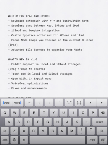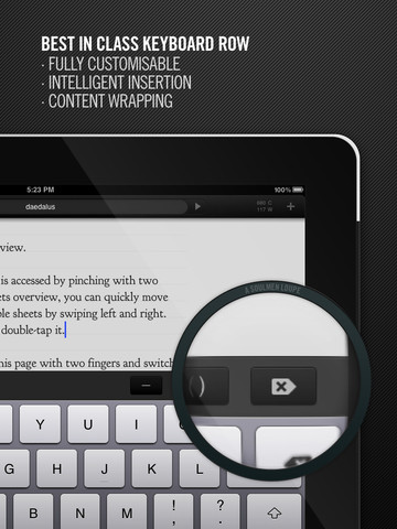 The keyboard has an extra row above the keyboard, which contains keys for tabs, parentheses, double quotes, a dash, a colon and a forward delete. These, however, are just the defaults, so you can customise this row to include anything you like. The app also features a TextExpander option, which allows for larger text making it easy to read. It also has the capability of handling large documents i.e. 20,000 words or more.