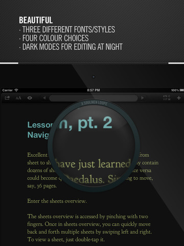 Daedalus Touch offers character and word count, as well as three different font choices and four different colour choices including a “dark mode” for writing at night. As an added bonus, the app has a built-in web browser to quickly look up or post stuff on the internet.