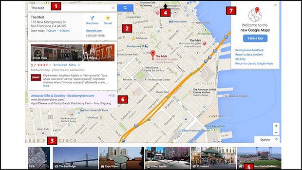The very first thing that will strike you with the new Google maps, is the change to the user interface. While the search bar is still located in the upper left, the map now fills the entire screen. In terms of searching, Google has removed the Top results column and has replaced it with suggested locations that are highlighted and named on the map itself. Google have also introduced different views of search results; results can be sorted by “top reviewers,” Google+ social circle or “top results.”